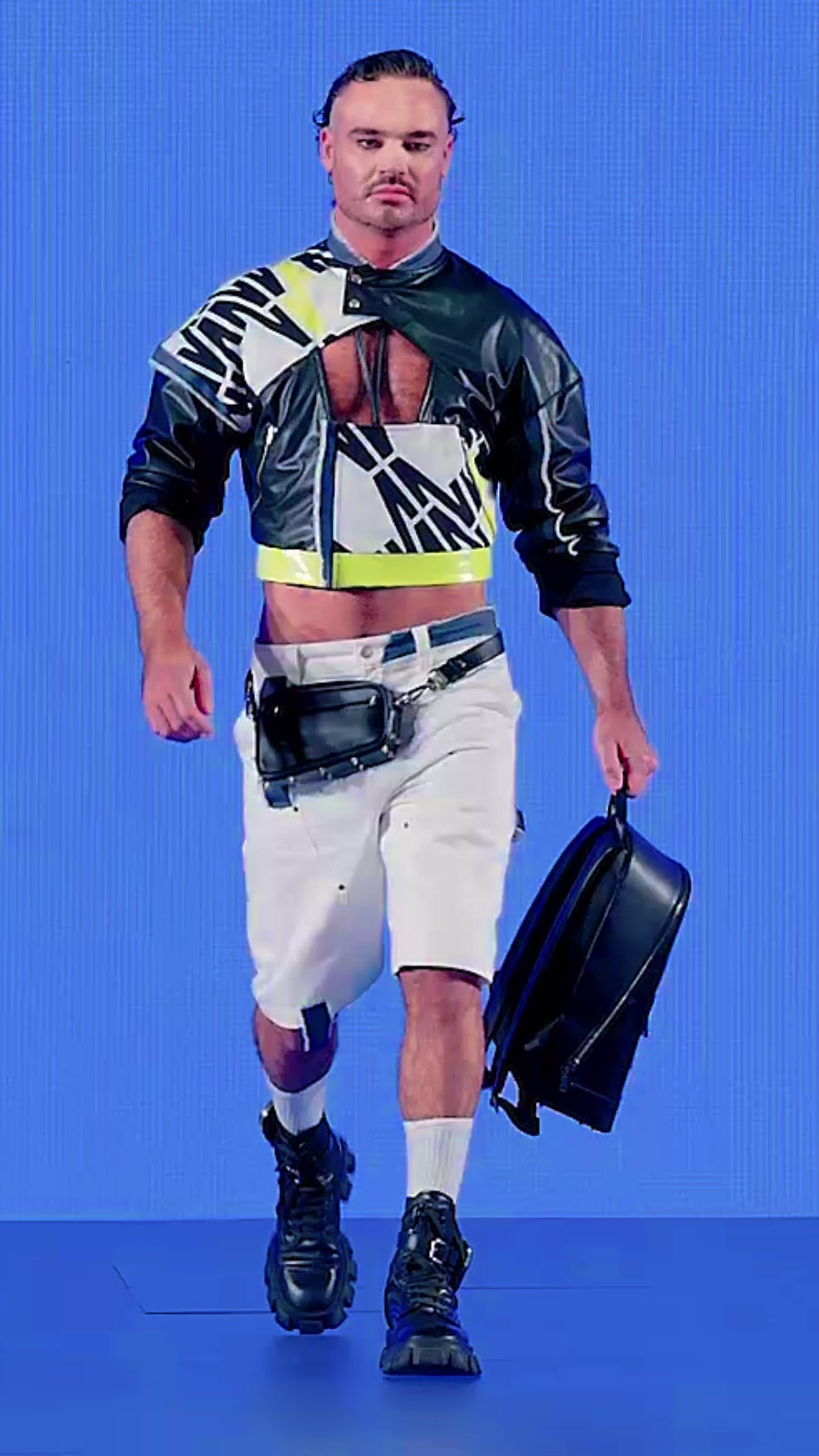 Sport-tailored attitude: a cropped hybrid moto with chest cut-out and volt hem teams with clean white slash-gusset Bermudas.